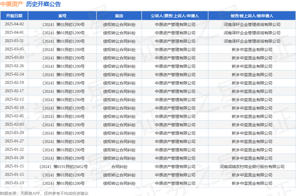 本站消息,根据天眼查APP显示,近日公布了一则中原资产管理有限公司作为原告/上诉人的开庭公告,详细内容如下: